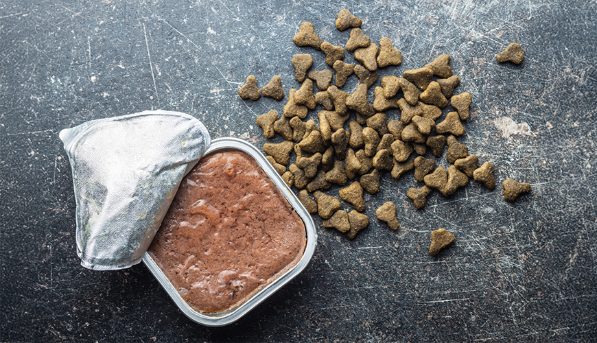 الطعام الرطب، أو الطعام المعلب، يحتوي على نفس العناصر الغذائية الأساسية الموجودة في الطعام الجاف، لكنه غني بالرطوبة. يتم طهي المكونات وختمها في علب أو أكياس للحفاظ على النكهة والنضارة.